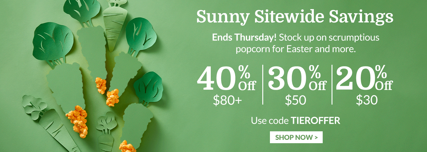 If you're looking to buy extra-special gifts for popcorn lovers or those who simply love snacks, you're just a few clicks away. We offer an outstanding selection of popcorn baskets, gourmet popcorn college gifts, gourmet popcorn towers, gourmet popcorn gift boxes and popcorn tins-many of our fun designs can be customized with your personal message, photo or gift tag. This Spring, we have you covered with Easter popcorn gifts of seasonal tins, sweet popcorn gifts and Easter baskets, perfect for kids or sharing with family. Delicious, people-pleasing food, candy and gifts from The Popcorn Factory make the perfect gift for anyone, for any reason and at any price. There's nothing more thrilling than opening the door to your home to find a gourmet popcorn gift created by The Popcorn Factory. It's no surprise we've been the authority popcorn store for more than 40 years! Some of the best gifts for popcorn lovers are Strawberry Sparkling Wine Flavored Popcorn, Habanero Seasoned Popcorn and new flavors Dill Pickle Flavored Popcorn and Hot Honey Popcorn.